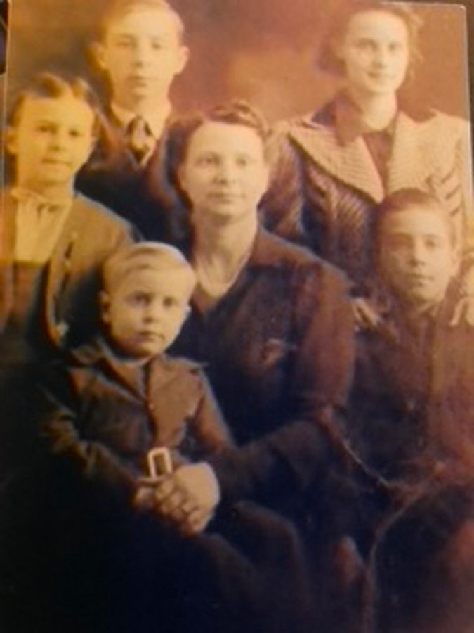 Cora Lee, Tommy back row, Evelyn on right, Barbara on the left next to Cora Lee, Dallas in her lap and Paul on the right below Evelyn.
